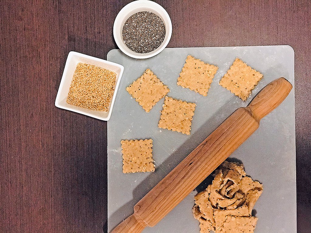 Mezclar los ingredientes secos, agregar en el centro el aceite, la miel, y de a poco ir añadiendo el agua hasta obtener una masa de galleta, estirar con ayuda de un uslero y cortar en forma de galleta. Hornear por 12 minutos a 180 ºC.