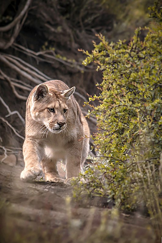 Una ´anécdota´ de este tiempo, la que más recuerdo y atesoro (foto inferior), es la del día que me topé con este puma, como en ese momento no tenía mucho conocimiento, no lo vi hasta que él quiso que lo viera, 7 metros nos separaban, él estaba agazapado entre unos matorrales, apenas hicimos contacto visual salió lentamente y comenzó a acercarse, siempre agazapado, llego a unos 4 metros y mientras avanzaba, pensé; ´ya estoy acá´ …aterrado hice lo que no se recomienda y no haría nunca más, me agache un poco y a la altura de sus ojos hice varias fotos, me puse de pie muy lento y no sabría decir cuánto tiempo pasó, para mí fue una eternidad. El puma también se quedó ahí sin hacer nada, olfateó un poco y luego comenzó a caminar en dirección contraria y cada ciertos metros se detenía para mirar hacia atrás, a unos 15 metros de mi posición marco su territorio y se echó. Esa mirada se me quedo grabada en la mente, es el momento más salvaje y aterrador que me ha tocado vivir, viví el presente como nunca antes. Tener retratado el momento más tenso de este encuentro es una locura que abrió mis ojos y me hizo tomar una buena decisión. ¡Aprender!